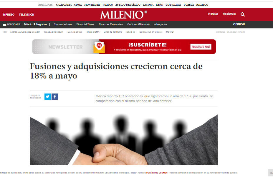México reportó 132 operaciones, que significaron un alza de 17.86 por ciento, en comparación con el mismo periodo del año anterior. https://www.milenio.com/negocios/fusiones-y-adquisiciones-crecieron-18-hasta-mayo