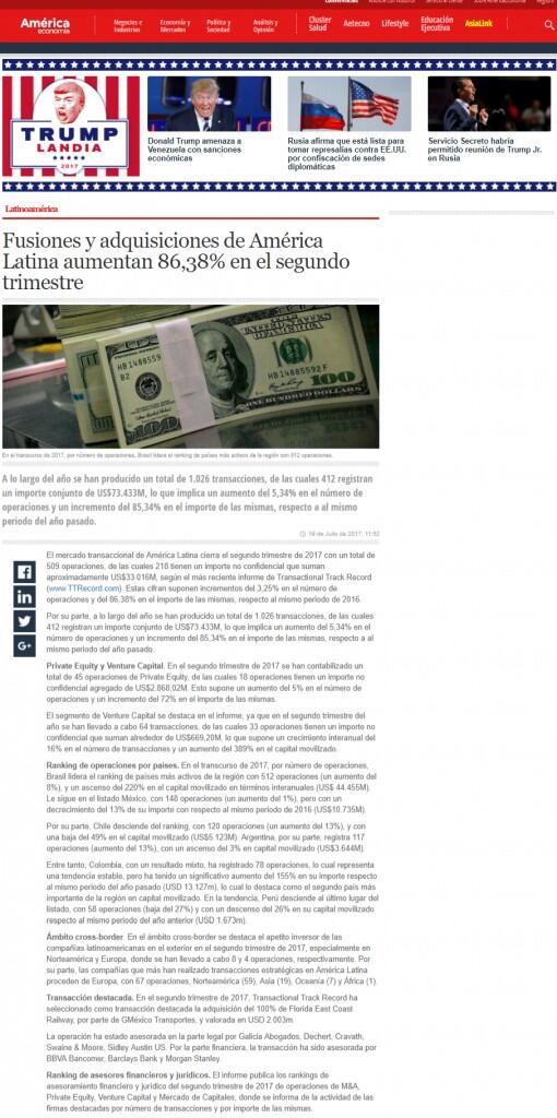 Transacción destacada. En el segundo trimestre de 2017, Transactional Track Record ha seleccionado como transacción destacada la adquisición del 100% de Florida East Coast Railway, por parte de GMéxico Transportes, y valorada en USD 2.003m.