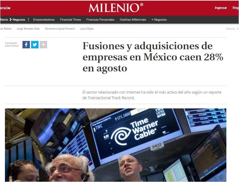 El sector relacionado con Internet ha sido el más activo del año según un reporte de Transactional Track Record. https://www.milenio.com/negocios/mexico-fusiones-y-adquisiciones-caen-en-agosto