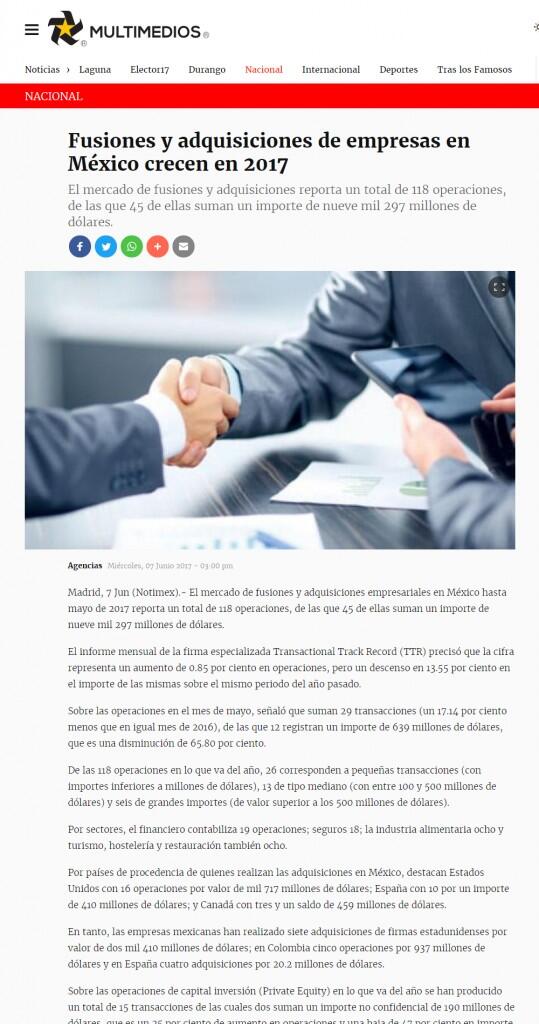 Madrid, 7 Jun (Notimex).- El mercado de fusiones y adquisiciones empresariales en México hasta mayo de 2017 reporta un total de 118 operaciones, de las que 45 de ellas suman un importe de nueve mil 297 millones de dólares.