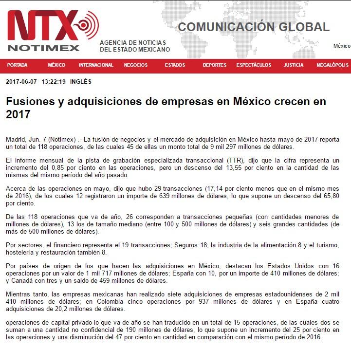 El mercado de fusiones y adquisiciones empresariales en México hasta mayo de 2017 reporta un total de 118 operaciones, de las que 45 de ellas suman un importe de 9,297 millones de dólares.