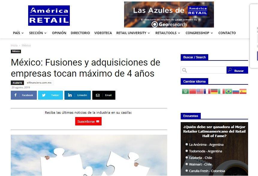 “En el transcurso de 2019 disminuyó el número de transacciones (fusiones y adquisiciones) registradas en México, en comparación con julio de 2018. Estos resultados reflejan el efecto de reajuste en la economía nacional”, afirmó Marcela Chacón, representante de RBI para América Latina de la consultora TTR.