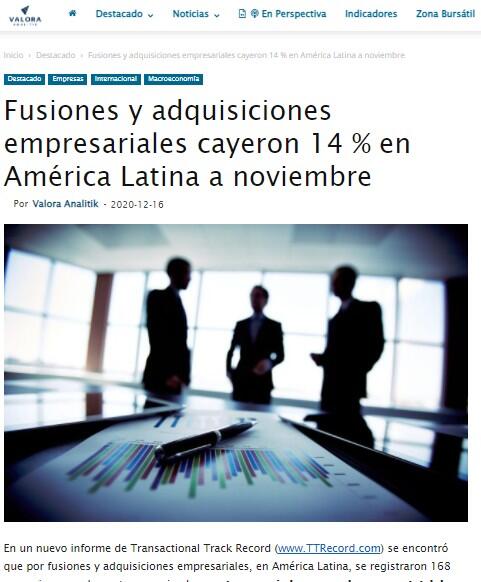 Argentina es uno de los países destacados para este informe pues sube una posición en el ranking, y desplaza a Colombia al registrar 129 acuerdos por fusiones o adquisiciones; sin embargo, el dato cae 13 % frente a noviembre de 2019. El dinero que representaron esas operaciones llegó a los US$1.914 millones cae 63 %.