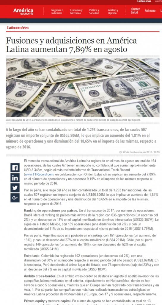 El mercado transaccional de América Latina ha registrado en el mes de agosto un total de 164 operaciones, de las cuales 67 tienen un importe no confidencial que suman aproximadamente USD 8.343m, según el más reciente informe de Transactional Track Record (www.TTRecord.com, en colaboración con Ontier. Estas cifras implican un aumento del 7,89% en el número de operaciones y un descenso 9,15% en el importe de las mismas respecto al mismo periodo de 2016.