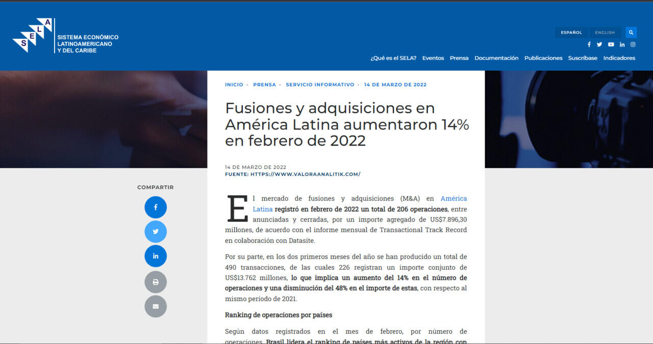 El mercado de fusiones y adquisiciones (M&A) en América Latina registró en febrero de 2022 un total de 206 operaciones, entre anunciadas y cerradas, por un importe agregado de US$7.896,30 millones, de acuerdo con el informe mensual de Transactional Track Record en colaboración con Datasite.