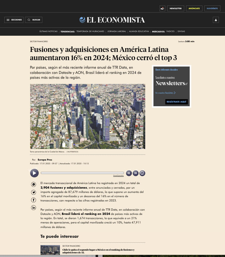Por países, según el más reciente informe anual de TTR Data, en colaboración con Datasite y AON, Brasil lideró el ranking en 2024 de países más activos de la región. En total, se dieron 1,674 transacciones, lo que equivale a un 21% menos de operaciones, pero el capital movilizado creció un 10%, hasta 47,911 millones de dólares.