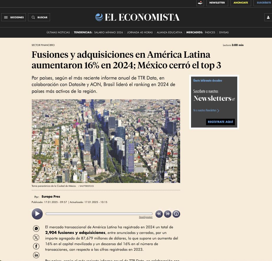 Por países, según el más reciente informe anual de TTR Data, en colaboración con Datasite y AON, Brasil lideró el ranking en 2024 de países más activos de la región.