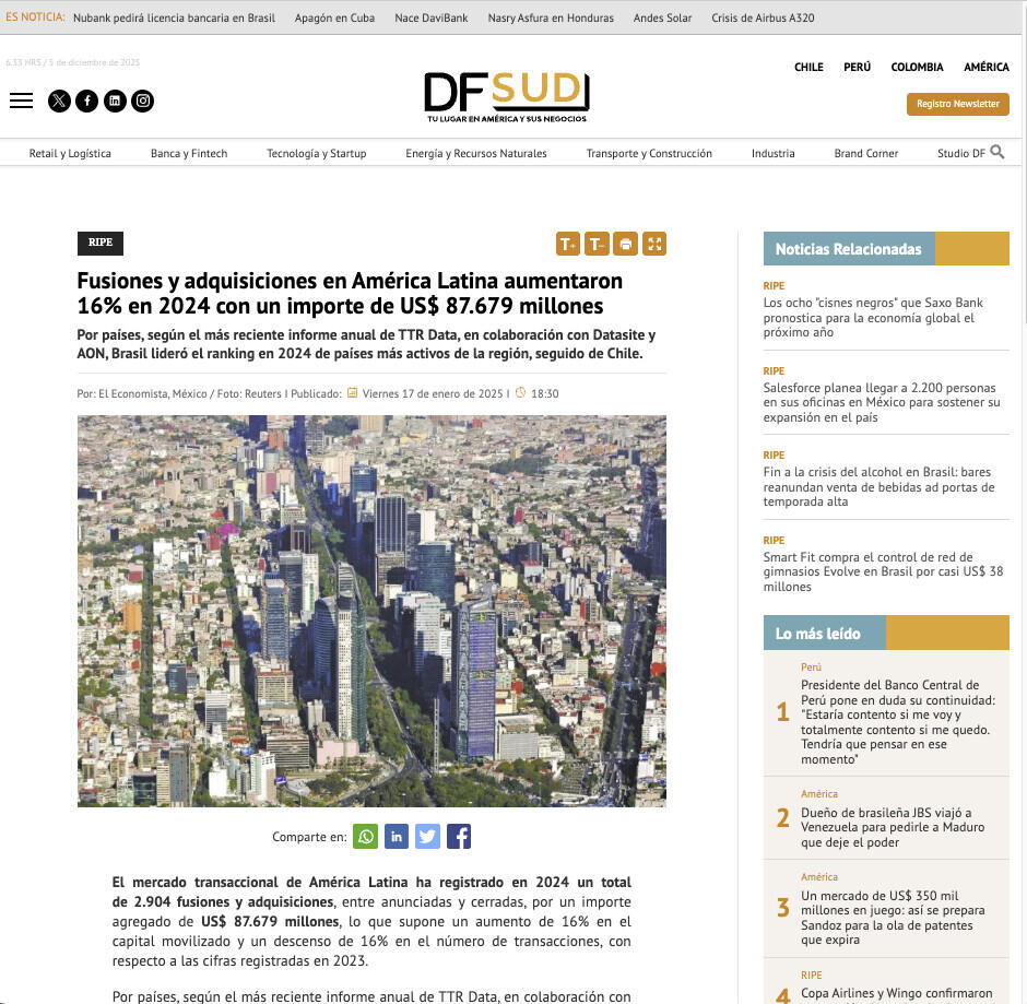 Por países, según el más reciente informe anual de TTR Data, en colaboración con Datasite y AON, Brasil lideró el ranking en 2024 de países más activos de la región, seguido de Chile.