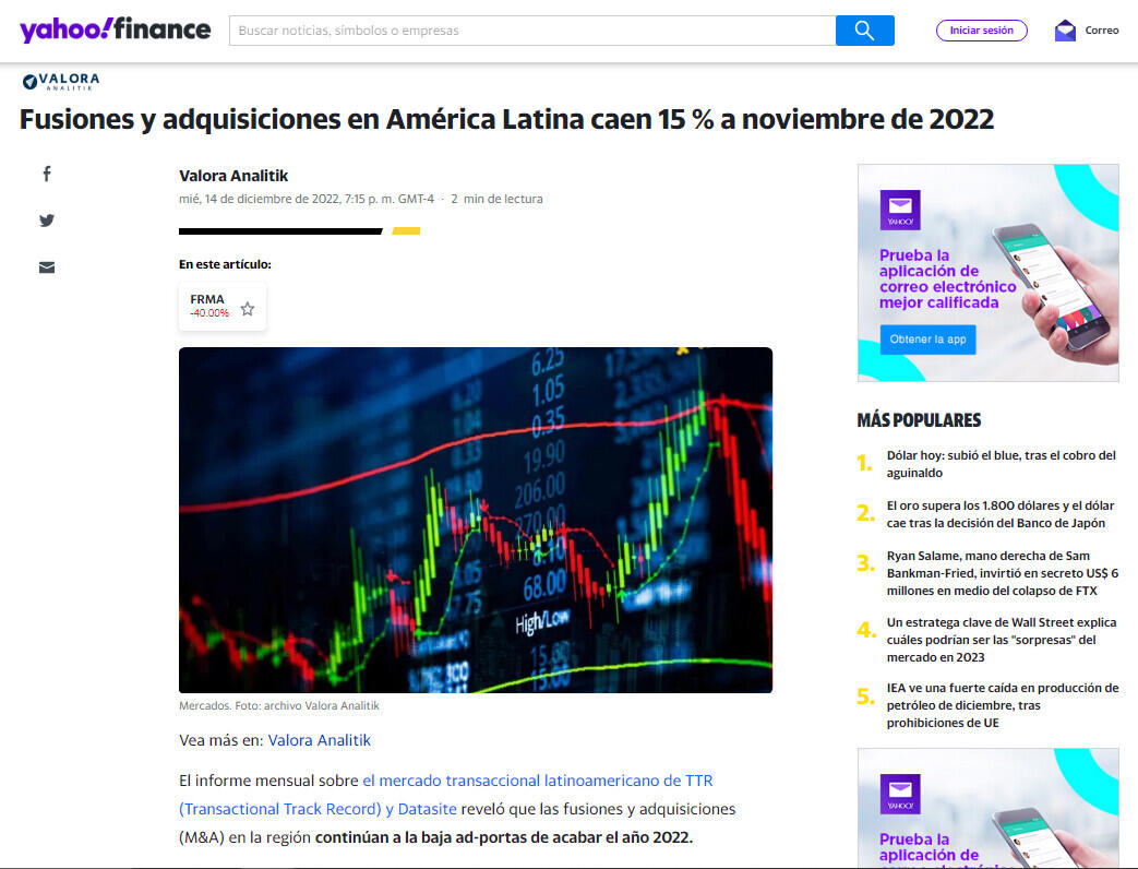 El informe mensual sobre el mercado transaccional latinoamericano de TTR (Transactional Track Record) y Datasite reveló que las fusiones y adquisiciones (M&A) en la región continúan a la baja ad-portas de acabar el año 2022.
