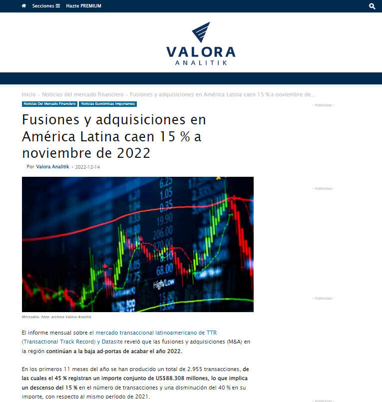 El informe mensual sobre el mercado transaccional latinoamericano de TTR (Transactional Track Record) y Datasite reveló que las fusiones y adquisiciones (M&A) en la región continúan a la baja ad-portas de acabar el año 2022.