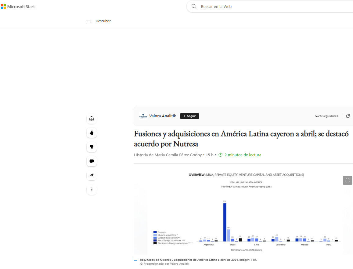 Fusiones y adquisiciones en América Latina cayeron a abril; se destacó acuerdo por Nutresa