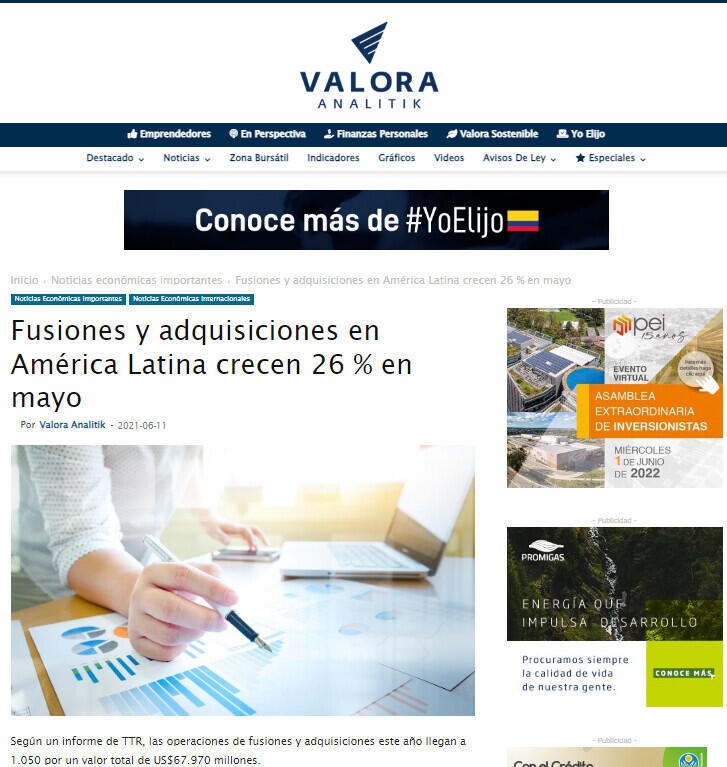 Brasil, México, Chile y Colombia, países que registran mayor crecimiento hasta mayo. El mercado de M&A (fusiones y adquisiciones) en América Latina ha contabilizado en mayo de 2021 un total de 180 fusiones y adquisiciones, entre anunciadas y cerradas, por un importe agregado de US$ 8.215,43 millones, de acuerdo con el informe mensual de Transactional Track Record (www.TTRecord.com) en colaboración con Datasite (www.datasite.com). Vea más en internacional.