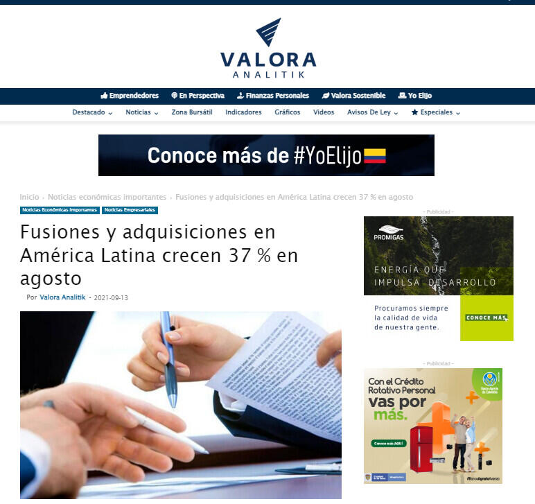 El mercado de M&A en América Latina ha contabilizado en agosto de 2021 un total de 280 fusiones y adquisiciones, entre anunciadas y cerradas, por un importe agregado de US$ 7.511 millones, de acuerdo con el informe mensual de Transactional Track Record (www.TTRecord.com) en colaboración con Datasite (www.datasite.com). Vea más en Empresas.
