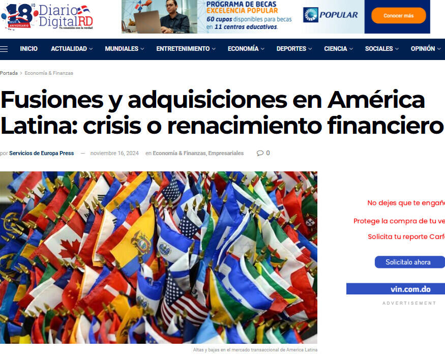 Santo Domingo.-América Latina enfrenta un panorama mixto en su mercado de fusiones y adquisiciones, con marcadas diferencias entre países y sectores. Hasta octubre la región totalizó 2,307 fusiones y adquisiciones (tanto anunciadas como cerradas), con un importe agregado de 66,867 millones de dólares (66,352 millones de euros).