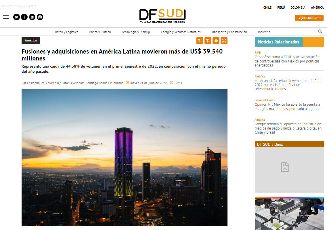 Según el más reciente informe de Transactional Track Record en colaboración con Datasite y AON sobre el mercado de fusiones, adquisiciones, capital privado e inversiones en América Latina, durante el primer semestre se transaron US$39.540 millones a través de 1.317 movimientos, lo que representó una caída de 44,38% de volumen frente al mismo periodo del año pasado.