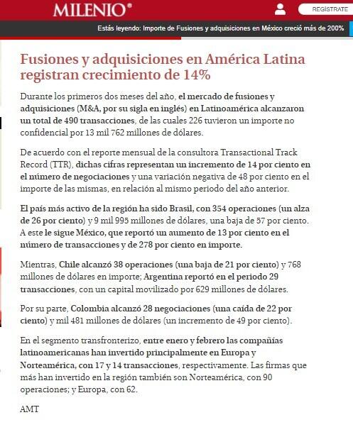 Durante los primeros dos meses del año, el mercado de fusiones y adquisiciones (M&A, por su sigla en inglés) en Latinoamérica alcanzaron un total de 490 transacciones, de las cuales 226 tuvieron un importe no confidencial por 13 mil 762 millones de dólares. De acuerdo con el reporte mensual de la consultora Transactional Track Record (TTR), dichas cifras representan un incremento de 14 por ciento en el número de negociaciones y una variación negativa de 48 por ciento en el importe de las mismas, en relación al mismo periodo del año anterior. El país más activo de la región ha sido Brasil, con 354 operaciones (un alza de 26 por ciento) y 9 mil 995 millones de dólares, una baja de 57 por ciento. A este le sigue México, que reportó un aumento de 13 por ciento en el número de transacciones y de 278 por ciento en importe. Mientras, Chile alcanzó 38 operaciones (una baja de 21 por ciento) y 768 millones de dólares en importe; Argentina reportó en el periodo 29 transacciones, con un capital movilizado por 629 millones de dólares. Por su parte, Colombia alcanzó 28 negociaciones (una caída de 22 por ciento) y mil 481 millones de dólares (un incremento de 49 por ciento). En el segmento transfronterizo, entre enero y febrero las compañías latinoamericanas han invertido principalmente en Europa y Norteamérica, con 17 y 14 transacciones, respectivamente. Las firmas que más han invertido en la región también son Norteamérica, con 90 operaciones; y Europa, con 62. https://www.milenio.com/negocios/importe-fusiones-adquisiciones-mexico-repuntaron-200