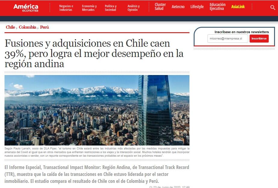 Transactional Track Record (TTR), plataforma de inteligencia empresarial especializada en datos del mercado transaccional, lanzó la tercera edición del Informe Especial, Transactional Impact Monitor: Región Andina, donde Chile sale mejor posicionada pese a su repentina desaceleración por los efectos de la Covid-19.