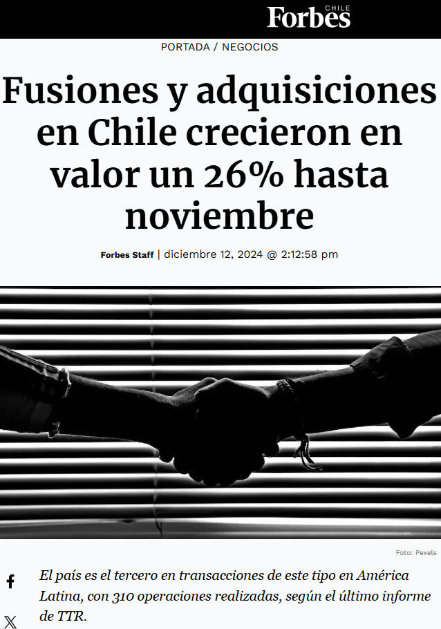 Fusiones y adquisiciones en Chile crecieron en valor un 26% hasta noviembre