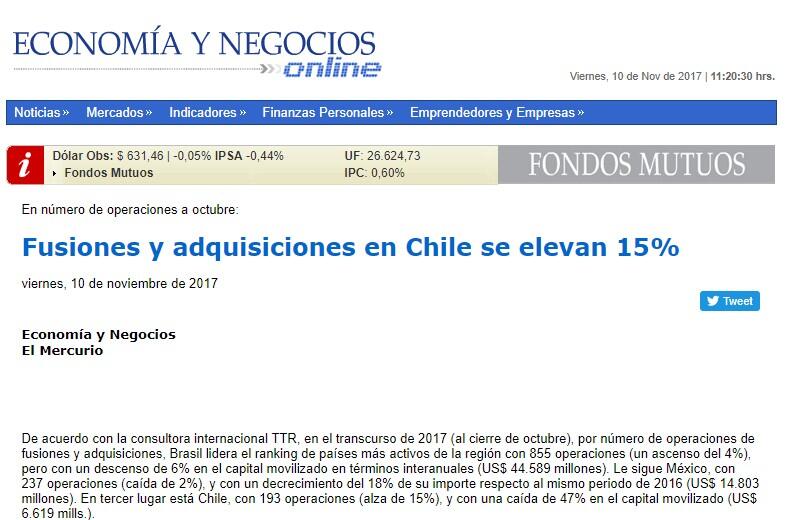 De acuerdo con la consultora internacional TTR, en el transcurso de 2017 (al cierre de octubre), por número de operaciones de fusiones y adquisiciones, Brasil lidera el ranking de países más activos de la región con 855 operaciones (un ascenso del 4%), pero con un descenso de 6% en el capital movilizado en términos interanuales (US$ 44.589 millones).