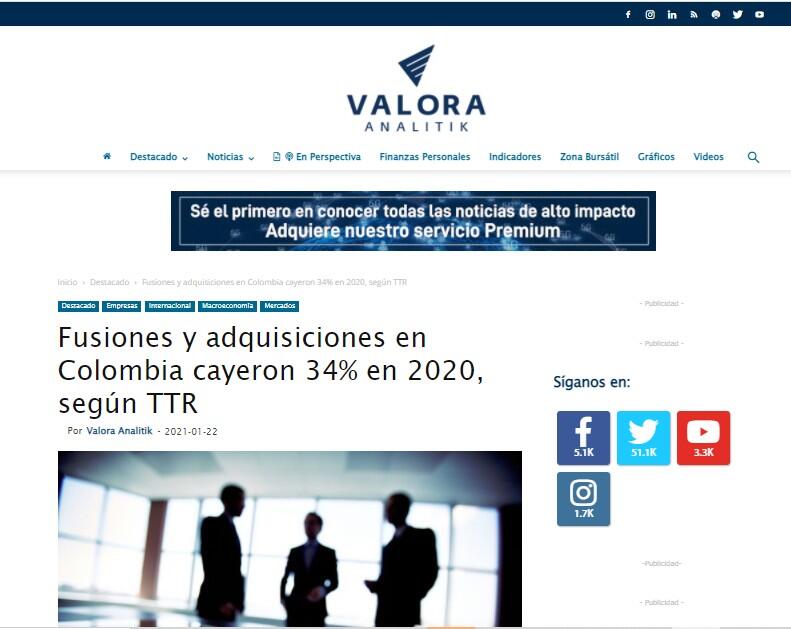 Fusiones y adquisiciones en Colombia cayeron 34% en 2020, según TTR