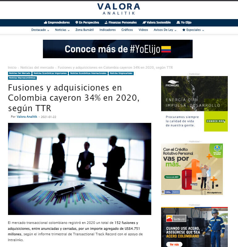 El mercado transaccional colombiano registró en 2020 un total de 152 fusiones y adquisiciones, entre anunciadas y cerradas, por un importe agregado de US$4.751 millones, según el informe trimestral de Transactional Track Record con el apoyo de Intralinks.
