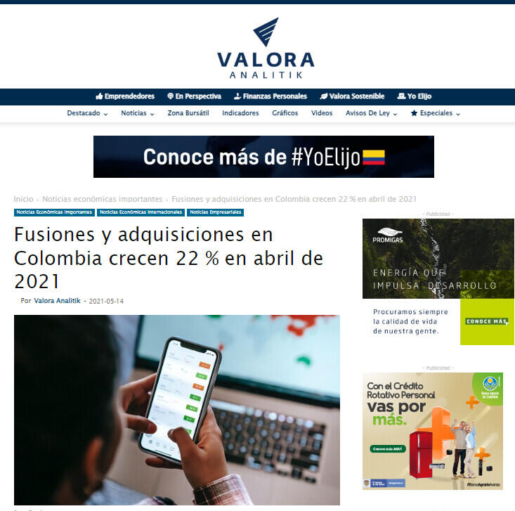 Fusiones y adquisiciones en Colombia crecen 22 % en abril de 2021
