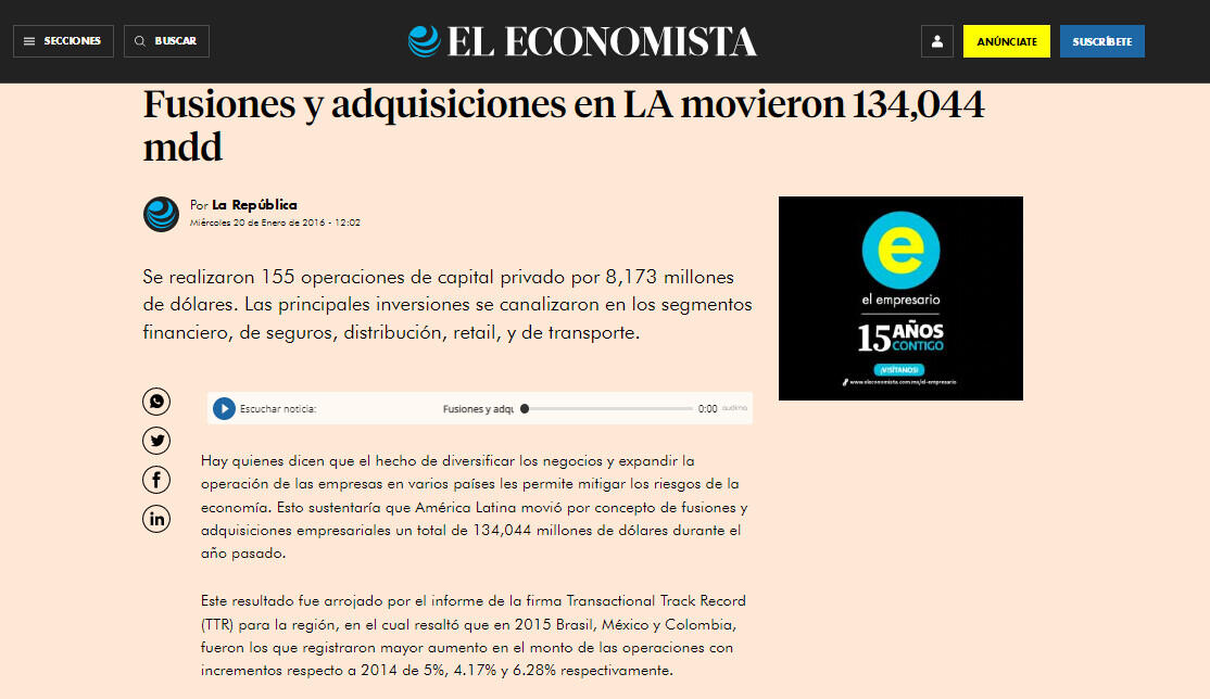 Este resultado fue arrojado por el informe de la firma Transactional Track Record (TTR) para la región, en el cual resaltó que en 2015 Brasil, México y Colombia, fueron los que registraron mayor aumento en el monto de las operaciones con incrementos respecto a 2014 de 5%, 4.17% y 6.28% respectivamente.