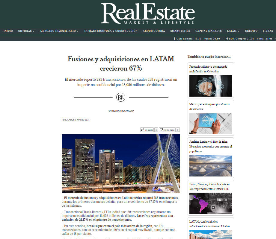 Transactional Track Record (TTR) indicó que 139 transacciones registraron un importe no confidencial por 13,958 millones de dólares. Las cifras representan una variación de 21.17% en el número de negociaciones.