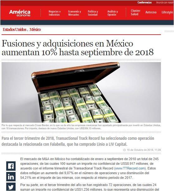 Para el tercer trimestre de 2018, Transactional Track Record ha seleccionado como operación destacada la relacionada con Falabella, que ha comprado Linio a LIV Capital.