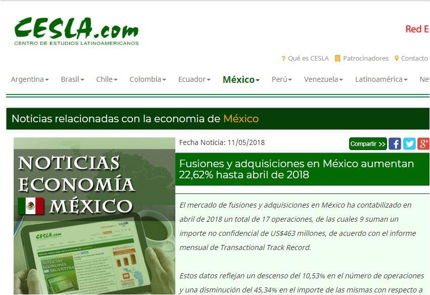 El mercado de fusiones y adquisiciones en México ha contabilizado en abril de 2018 un total de 17 operaciones, de las cuales 9 suman un importe no confidencial de US$463 millones, de acuerdo con el informe mensual de Transactional Track Record.