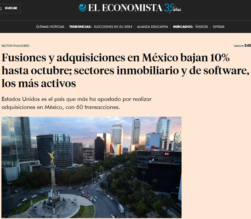 El mercado transaccional en México contabilizó hasta octubre de 2024 un total de 283 fusiones y adquisiciones, entre anunciadas y cerradas, por un importe agregado de 13,737 millones de dólares, lo que implica un descenso del 10% en el número de transacciones y un aumento del 13% en su importe, con respecto al mismo período de 2023.