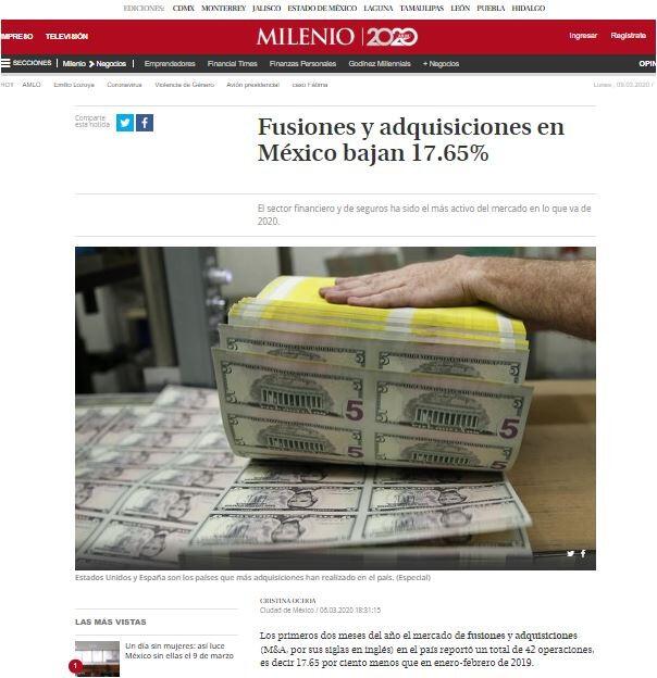 Te recomendamos: Gigante compra taquerías El Farolito A lo largo de 2020 el sector financiero y de seguros ha sido el más activo en el mercado, con un total de nueve operaciones; seguido se encuentra Internet, con cinco transacciones los primeros dos meses del año.