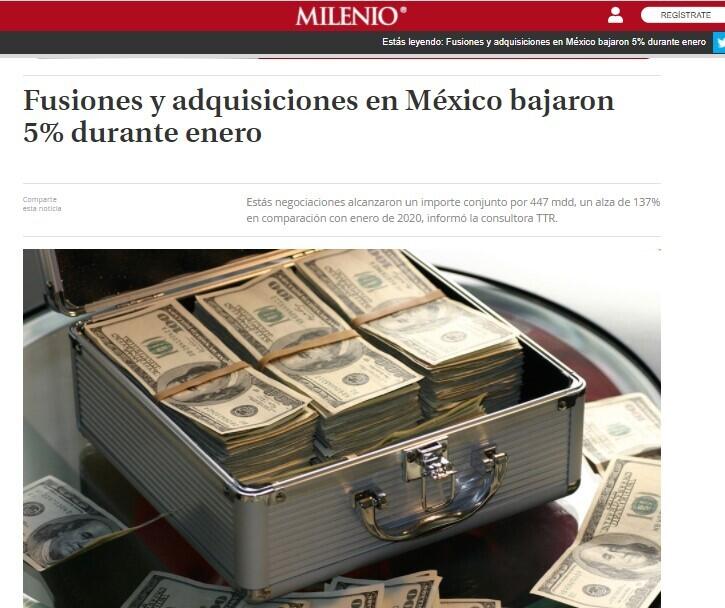 De acuerdo con el reporte mensual de la consultora Transactional Track Record (TTR), estás negociaciones alcanzaron un importe conjunto por 447 millones de dólares, un alza de 137 por ciento en comparación con enero de 2020. En términos sectoriales, el de internet, software y servicios IT ha sido el más activo del año, con cinco transacciones, así como el inmobiliario, con un total de cuatro transacciones. En el ámbito transfronterizo, durante enero las empresas mexicanas apostaron principalmente por invertir en Estados Unidos y Brasil, con dos transacciones cada uno.