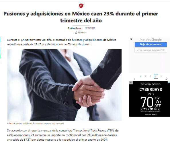 De acuerdo con el reporte mensual de la consultora Transactional Track Record (TTR), de estás operaciones, 21 sumaron un importe no confidencial por 993 millones de dólares, una caída de 57.87 por ciento respecto a lo reportado el primer cuarto de 2020.