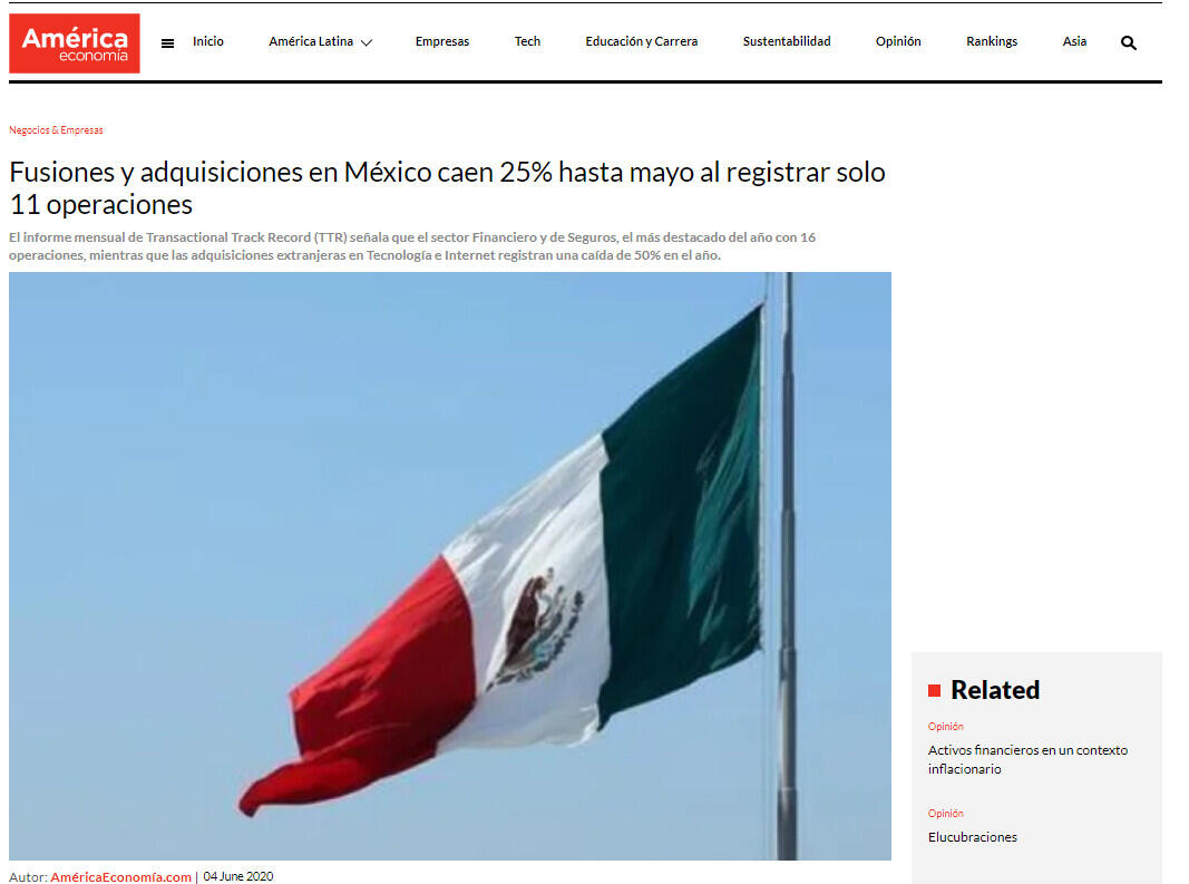 Madrid. El mercado de M&A en México contabilizó en mayo de 2020 un total de 11 fusiones y adquisiciones, entre anunciadas y cerradas, por un importe de US$145,6 millones, de acuerdo con el informe mensual de Transactional Track Record (TTR).