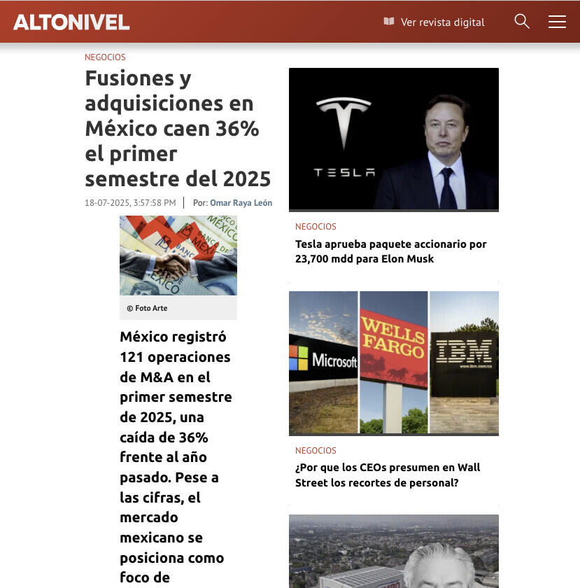 México registró 121 operaciones de M&A en el primer semestre de 2025, una caída de 36% frente al año pasado. Pese a las cifras, el mercado mexicano se posiciona como foco de inversiones estratégicas.