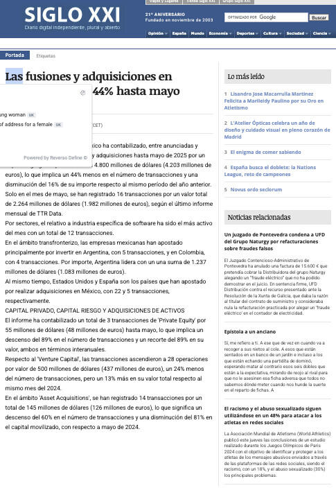Solo en el mes de mayo, se han registrado 16 transacciones por un valor total de 2.264 millones de dólares (1.982 millones de euros), según el último informe mensual de TTR Data.