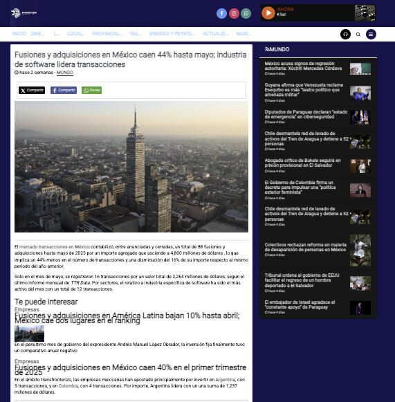 El mercado transacciones en México contabilizó, entre anunciadas y cerradas, un total de 88 fusiones y adquisiciones hasta mayo de 2025 por un importe agregado que asciende a 4,800 millones de dólares , lo que implica un 44% menos en el número de transacciones y una disminución del 16% de su importe respecto al mismo período del año anterior.