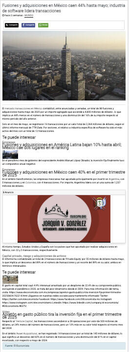 El mercado transacciones en México contabilizó, entre anunciadas y cerradas, un total de 88 fusiones y adquisiciones hasta mayo de 2025 por un importe agregado que asciende a 4,800 millones de dólares , lo que implica un 44% menos en el número de transacciones y una disminución del 16% de su importe respecto al mismo período del año anterior.