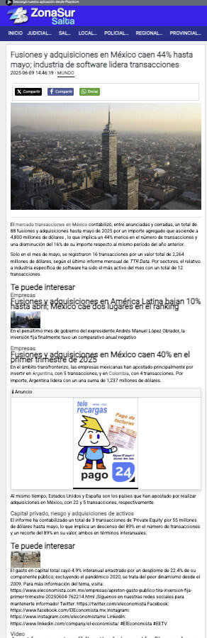 El mercado transacciones en México contabilizó, entre anunciadas y cerradas, un total de 88 fusiones y adquisiciones hasta mayo de 2025 por un importe agregado que asciende a 4,800 millones de dólares , lo que implica un 44% menos en el número de transacciones y una disminución del 16% de su importe respecto al mismo período del año anterior.