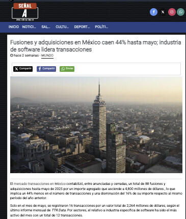 El mercado transacciones en México contabilizó, entre anunciadas y cerradas, un total de 88 fusiones y adquisiciones hasta mayo de 2025 por un importe agregado que asciende a 4,800 millones de dólares , lo que implica un 44% menos en el número de transacciones y una disminución del 16% de su importe respecto al mismo período del año anterior.