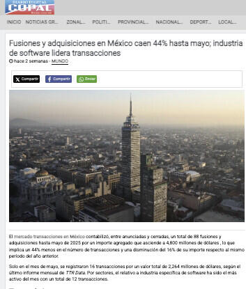 El mercado transacciones en México contabilizó, entre anunciadas y cerradas, un total de 88 fusiones y adquisiciones hasta mayo de 2025 por un importe agregado que asciende a 4,800 millones de dóMéxicoares , lo que implica un 44% menos en el número de transacciones y una disminución del 16% de su importe respecto al mismo período del año anterior.