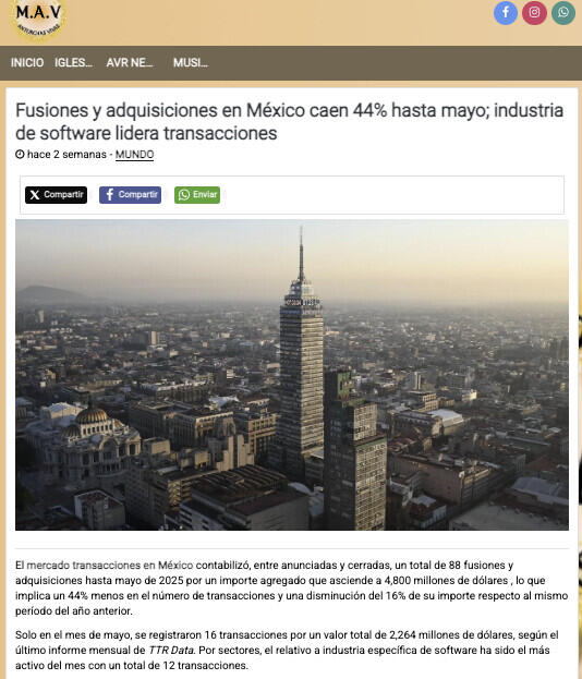 El mercado transacciones en México contabilizó, entre anunciadas y cerradas, un total de 88 fusiones y adquisiciones hasta mayo de 2025 por un importe agregado que asciende a 4,800 millones de dólares , lo que implica un 44% menos en el número de transacciones y una disminución del 16% de su importe respecto al mismo período del año anterior.