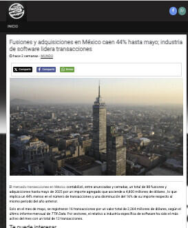 El mercado transacciones en México contabilizó, entre anunciadas y cerradas, un total de 88 fusiones y adquisiciones hasta mayo de 2025 por un importe agregado que asciende a 4,800 millones de dólares , lo que implica un 44% menos en el número de transacciones y una disminución del 16% de su importe respecto al mismo período del año anterior.