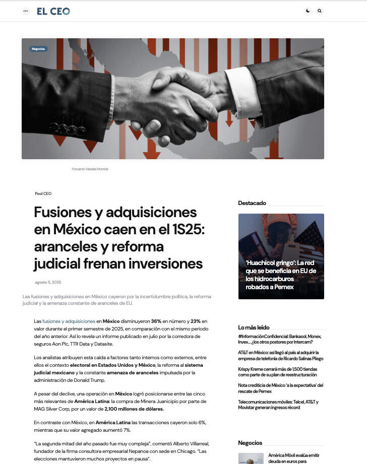 Fusiones y adquisiciones en México caen en el 1S25: aranceles y reforma judicial frenan inversiones