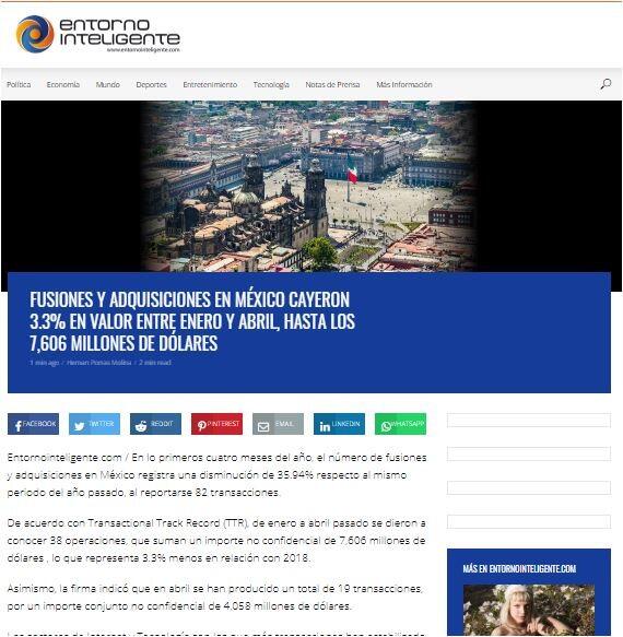 De acuerdo con Transactional Track Record (TTR), de enero a abril pasado se dieron a conocer 38 operaciones, que suman un importe no confidencial de 7,606 millones de dólares , lo que representa 3.3% menos en relación con 2018.