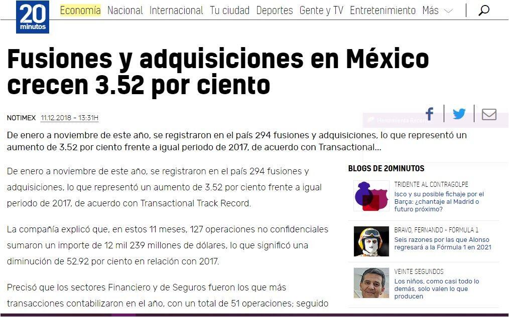De enero a noviembre de este año, se registraron en el país 294 fusiones y adquisiciones, lo que representó un aumento de 3.52 por ciento frente a igual periodo de 2017, de acuerdo con Transactional Track Record.