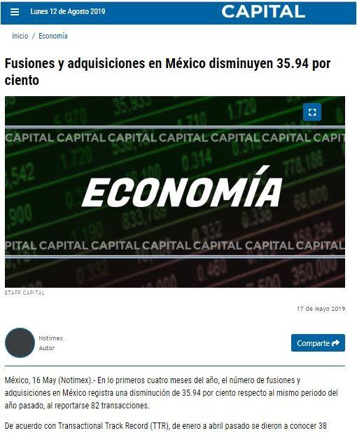 De acuerdo con Transactional Track Record (TTR), de enero a abril pasado se dieron a conocer 38 operaciones, que suman un importe no confidencial de siete mil 606 millones de dólares, lo que representa 3.3 por ciento menos en relación con 2018.
