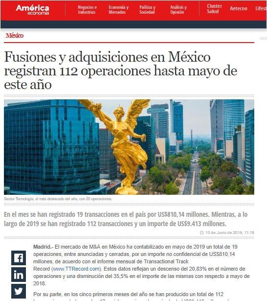El mercado de M&A en México ha contabilizado en mayo de 2019 un total de 19 operaciones, entre anunciadas y cerradas, por un importe no confidencial de US$810,14 millones, de acuerdo con el informe mensual de Transactional Track Record (www.TTRecord.com). Estos datos reflejan un descenso del 20,83% en el número de operaciones y una disminución del 35,5% en el importe de las mismas con respecto a mayo de 2018.
