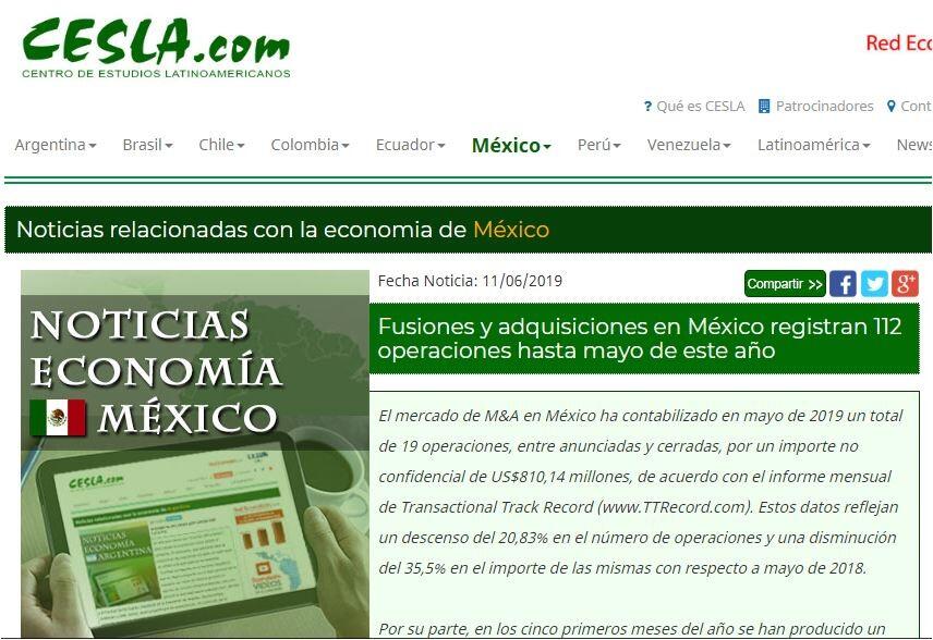 El mercado de M&A en México ha contabilizado en mayo de 2019 un total de 19 operaciones, entre anunciadas y cerradas, por un importe no confidencial de US$810,14 millones, de acuerdo con el informe mensual de Transactional Track Record (www.TTRecord.com). Estos datos reflejan un descenso del 20,83% en el número de operaciones y una disminución del 35,5% en el importe de las mismas con respecto a mayo de 2018.